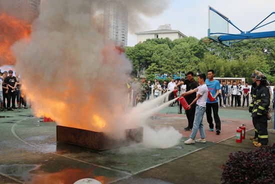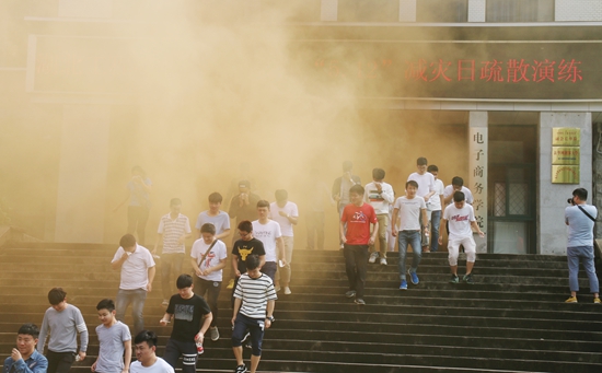 活动现场还举行了“5.12”防灾减灾演练。随着警报声响,启航楼内浓烟滚滚,师生捂住口鼻,低头弯腰迅速向楼外疏散,气氛紧张而有序。为达到预期效果,消防支队与卫计委还模拟了火灾扑救、伤员运输及120急救,场面逼真;为了锻炼学子们火灾扑救的动手能力,现场还设置了汽油盆和数十个灭火器,几名学生代表按照之前学习的灭火知识亲手将大火扑灭,过了一把消防员的瘾。