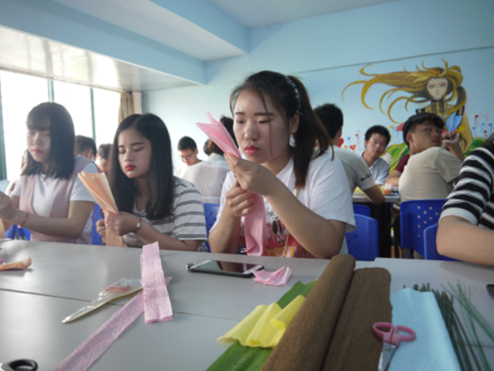 此次“感恩母亲”手工DIY活动为我院第七届“‘健康心灵·快乐同行’心理健康月”的系列活动之一。当天下午2点,通过前期自愿报名和筛选,45名学生顺利获得活动名额。在近3小时的活动中,学子们利用五颜六色的褶皱纸、铁丝、缎带在现场学习制作玫瑰花、百合花、太阳花,完成后利用包装纸将自己亲手制作的花朵加工成美丽的花束。在指导老师的详细讲解下,同学们全身心投入到制作花束的过程中。