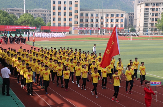 表演结束后,运动员陆续入场。首先入场的是由国旗班成员手擎国旗、校旗组成的第一方阵,接着是校徽队、校训队、鲜花队、彩旗队。在教职工方阵入场后,建筑与环境艺术学院、交通工程学院、经贸与信息学院、机电工程学院、电子商务学院、电气电子学院和志愿者代表队依次入场,他们肩负着全体职院人的期待,展现了各自的风采。